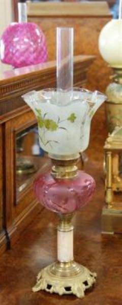 Victorian oil lamp on 4 column silver plated cherub base. cut glass font plated hinks double burner c1885.