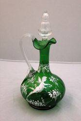 Victorian Green Glass Wine Jug and Stopper Decorated in the Mary Gregory Style. 28cm tall