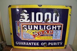 Vintage Sunlight 1000.00 Pound Soap Pictorial Packet Enamel Advertising Sign. Has very good bright colours. 91cm wide x 69cm high.