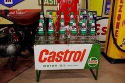 Genuine Castrol Tin Front Sign Rack. With 12 Genuine Oil Bottles, 6 @ 500ml and 6 @ 1 litre.. . 2 Baskets. New Old Stock Plastic Tops and Dust Caps that have been Re Stickered.