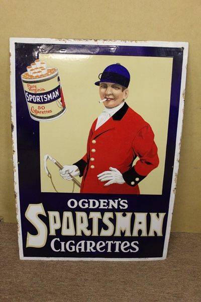 Ogdens Sportsman Cigarettes Pictorial Enamel Advertising. Sign 81cm x 56cm. Good rare sign.