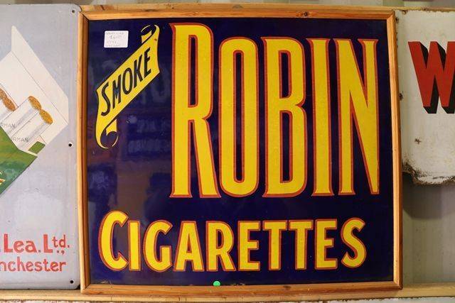Classic Framed Robin Cigs enamel advertising sign in very nice condition. 22x24ins