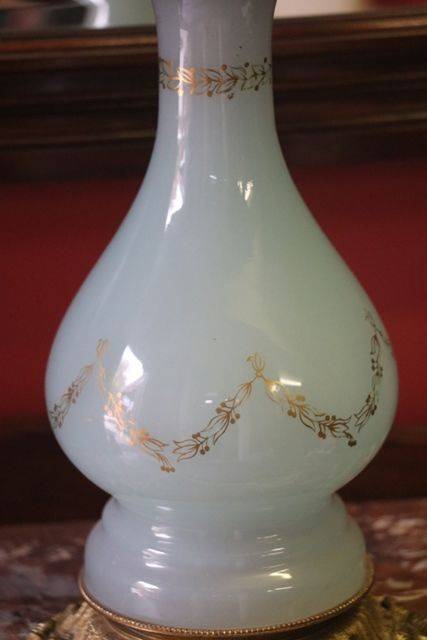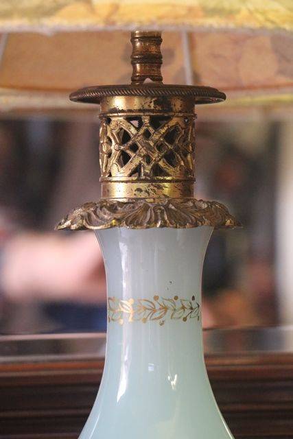 Large Victorian Banquet Lamp Green Font Vaseline Shade Brass Column