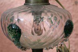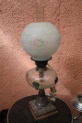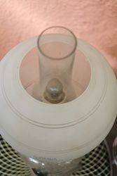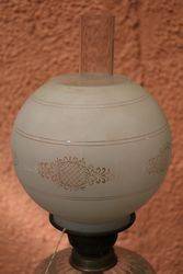 ID: LM109Exceptional Victorian Oil Lamp Cut Lead Glass Shade + Font Silver Plate Column. Chip to base of Shade