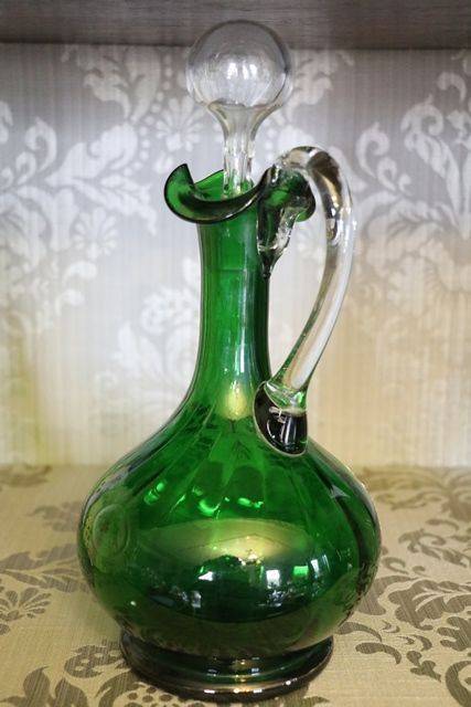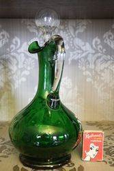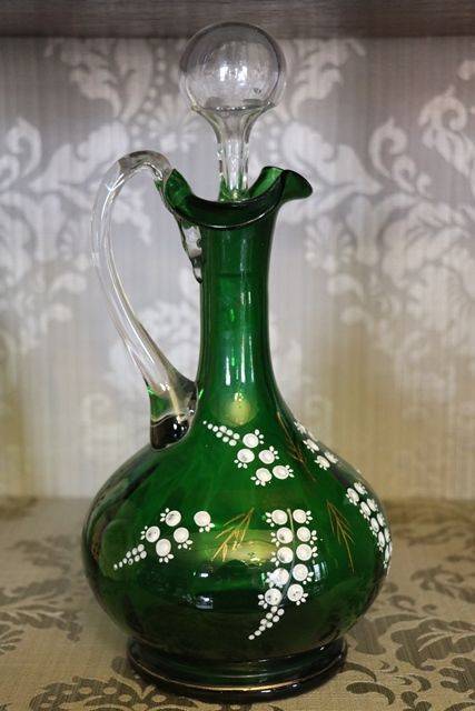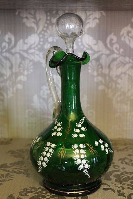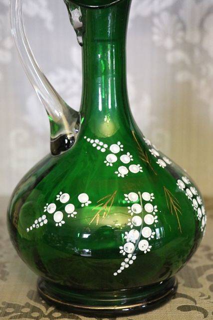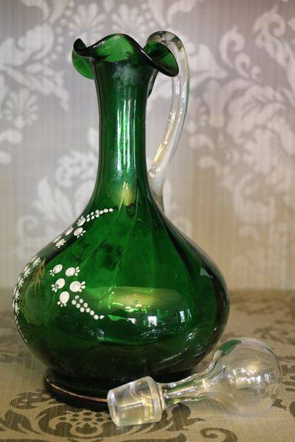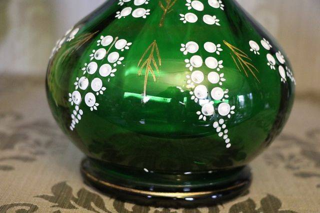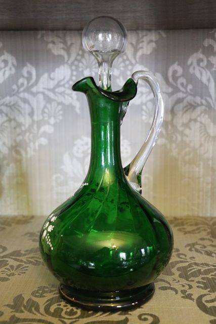 ID: GL135Victorian Green Glass Cameo Jug. Hand Enamel Decorated. 17cm tall