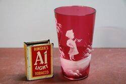 Antique Ruby Glass Mary Gregory Tumbler with Girl Watering Garden. 10cm high.