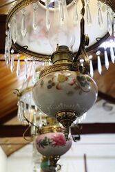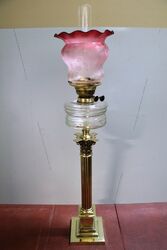 Antique Banquet Lamp on a Brass Corinthian Column. Clear Cut Glass Font, Double Burner, Genuine Ruby Acid Etched Globe, Lovely Example.. 94cm high.