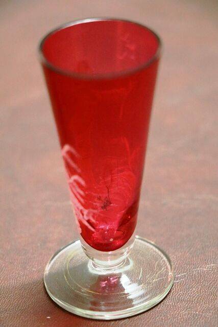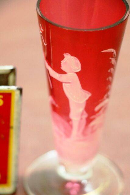 Antique Ruby Glass Mary Gregory Tumbler. Withe Girl Holding a Flower. 11cm high.