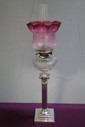Stunning Antique Banquet Lamp on Silver Plated Corinthian Column . Cut Crystal Font, Ruby Etched Shade & Double Burner. 83cm tall