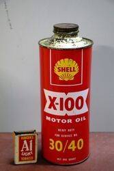 Vintage Shell X-100 Motor Oil 30/40. Quart Can. In Lovely Condition.