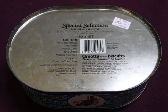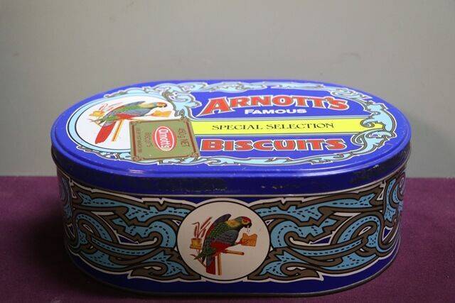 Arnotts Biscuit Tin, Large 1kg net. with Embossed Parrot.