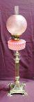 Stunning Victorian Double Burner Banquet Oil Lamp. Wonderful Brass Column Base, Pink Satin Glass Font with a Quality C20th Etched Glass Shade. 90cm tall