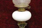 Victorian Oil Lamp Cut Glass Font Original Green Shade + Burner on a brass Corinthian base C1890