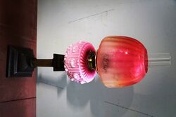 Victorian Oil Lamp, Double Burner Pink Milk Glass Font With Ruby Shade. Cast & Brass Column. 75cm high.