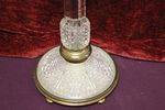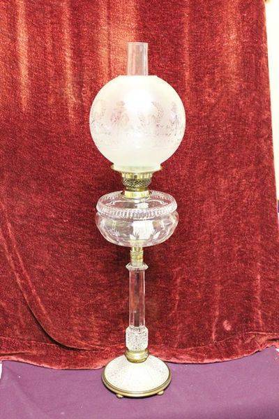 Large and Tall C19th Banquet oil lamp on rare brass corinthian column with brass font original double burner and glass shade. 105cm high.