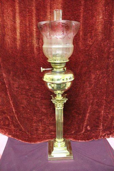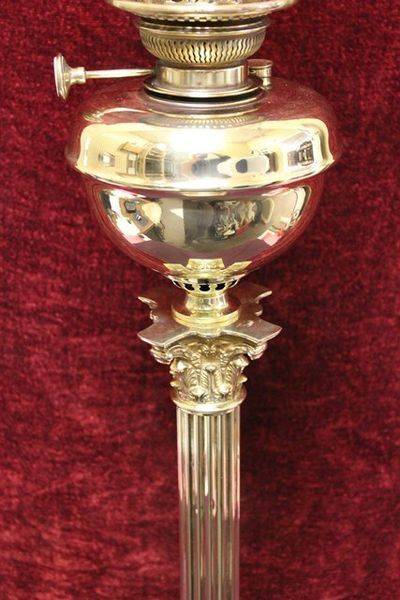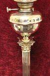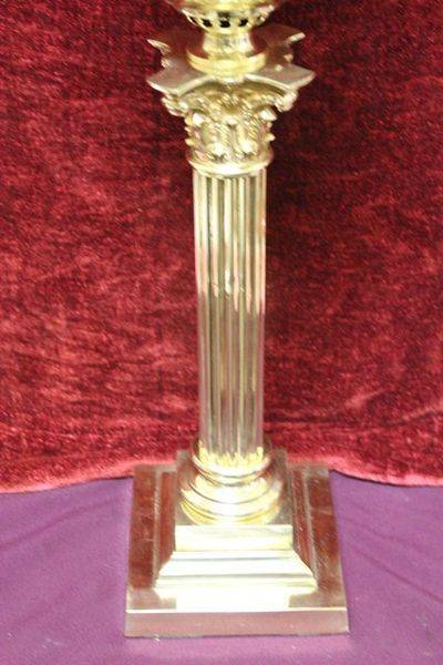 Large and Tall C19th Banquet oil lamp on rare brass corinthian column with brass font original double burner and glass shade. 105cm high.