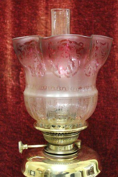 Stunning Victorian Banquet Lamp,Antique Ruby Shade superb cut glass font milk glass & ormolu column original double Burner C1885