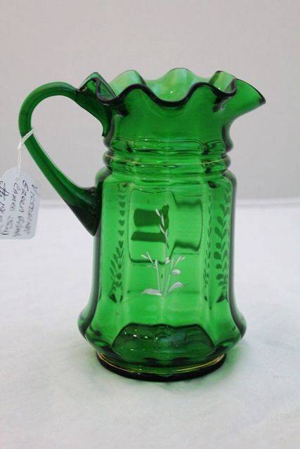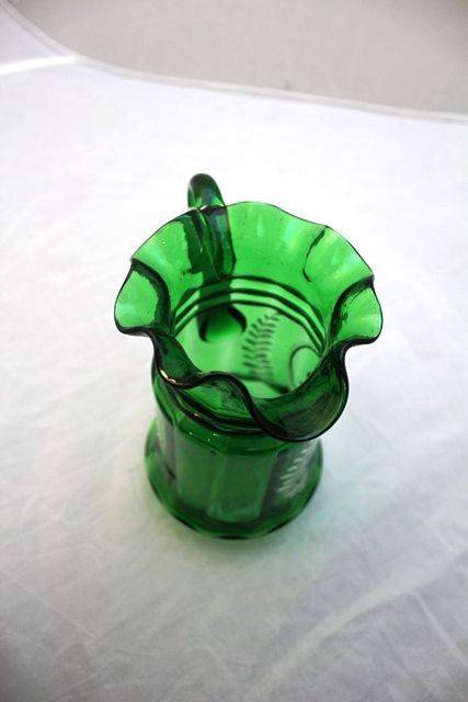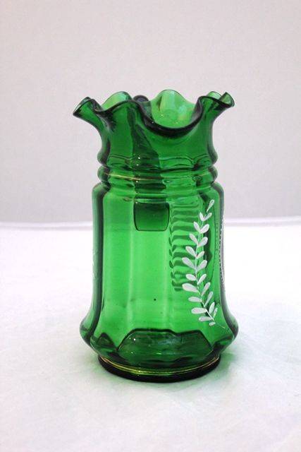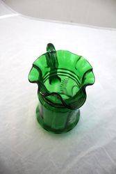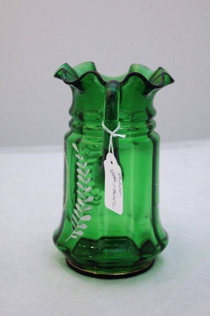 Pair of Late Victorian Antique Mary Gregory Green Glass Mugs, Hand Decorated. 9cm tall